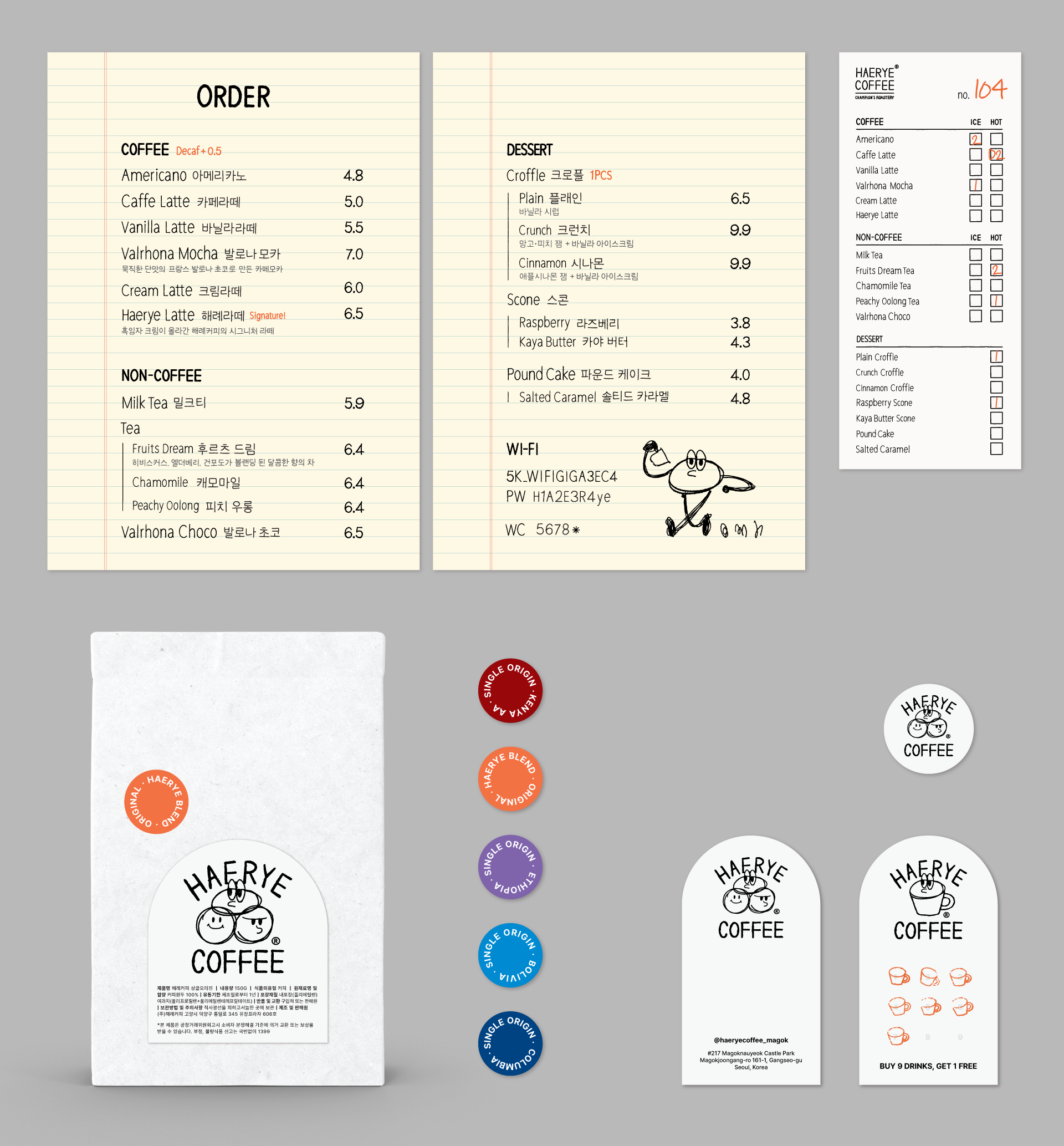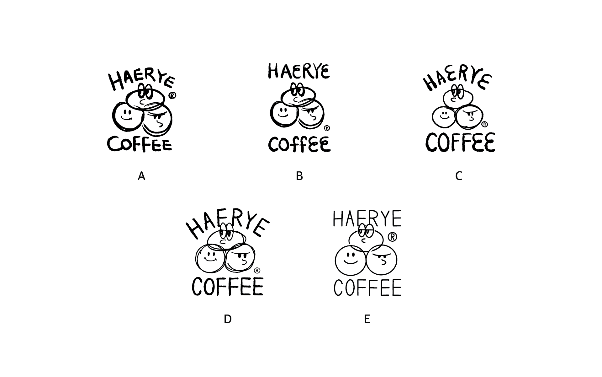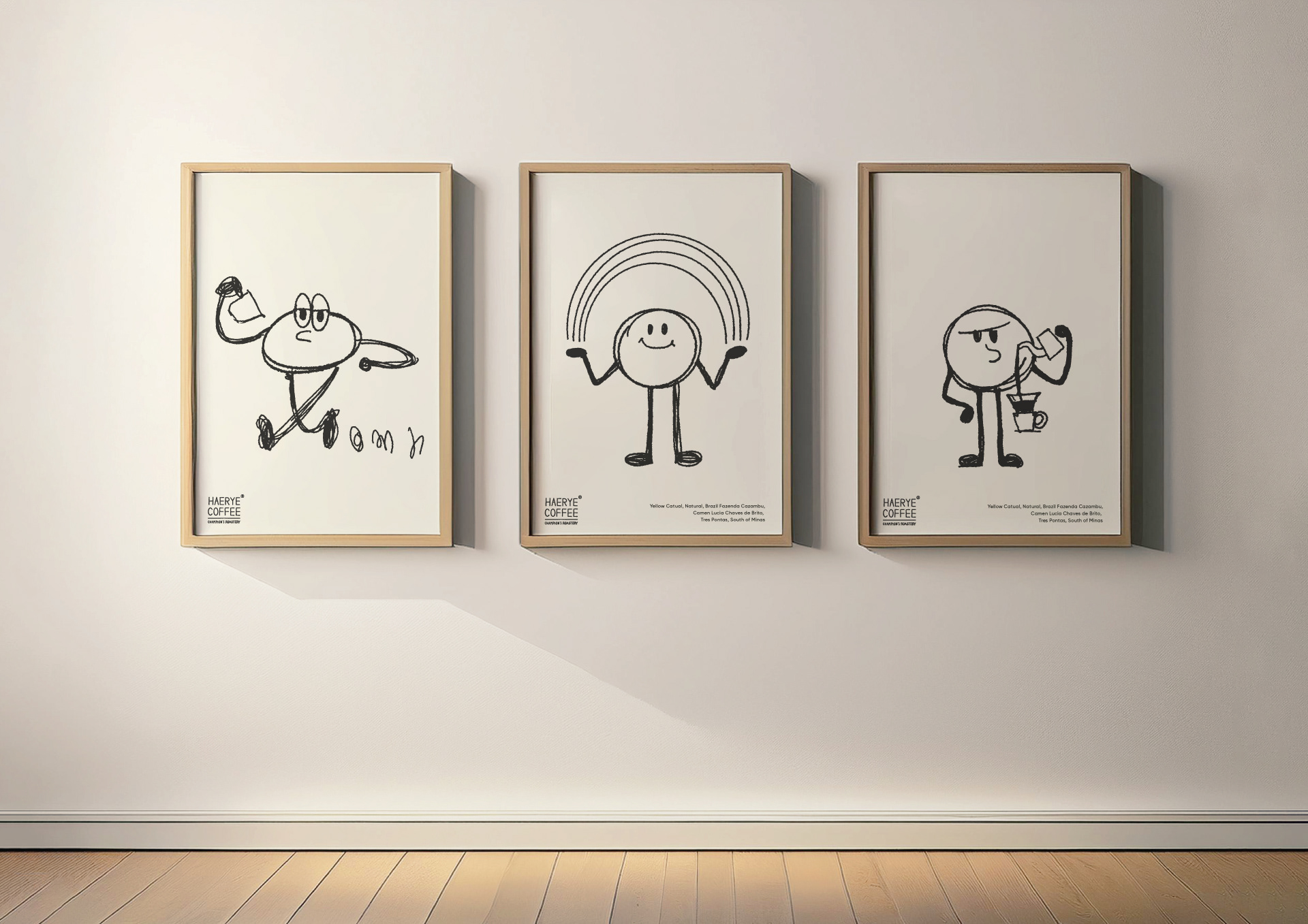 Haerye Coffee was founded by three dedicated baristas inspired by the Haerye (Explanatory Notes) of King Sejong the Great, reflecting their mission to research and simplify the art of coffee. While the flagship store pays homage to its roots with a Hangeul-focused design, the new branch sought a trendier mood through English branding and character-driven identity.