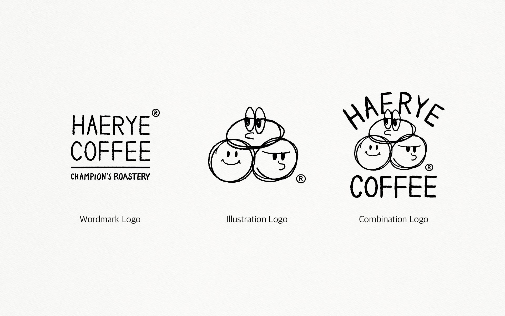 해례커피는 세명의 바리스타가 함께 창업한 카페 브랜드입니다. 클라이언트는 한국의 바리스타가 커피를 연구하고 알기 쉽게 설명한다는 의미에서 세종대왕 해례(解例)본에서 착안하여 해례라는 브랜드 이름을 지었습니다. 그에 걸맞게 본점은 한글로 디자인했고, 새로 오픈하는 지점은 영문표기와 캐릭터로 트랜디한 무드를 만들고 싶어하셨습니다. 처음에는 밤낮없이 커피를 연구한다는 의미에서 부엉이라는 소재로 아이데이션을 시작했는데, 아이디어 회의 중에 세명의 대표님을 상징하는 러프 스케치를 보시고, 흥미를 느껴서 그것을 그대로 로고화하기로 했습니다. 핸드드로잉을 활용하는만큼 그에 어울리는 손글씨 폰트를 개발하여 메뉴판과 워드마크로고로 제작했습니다.