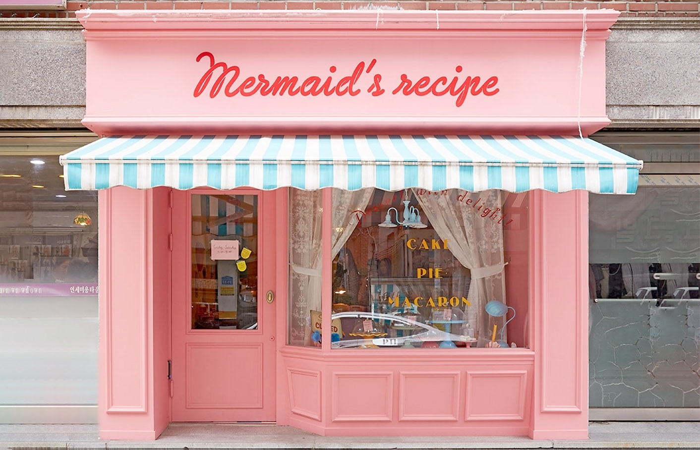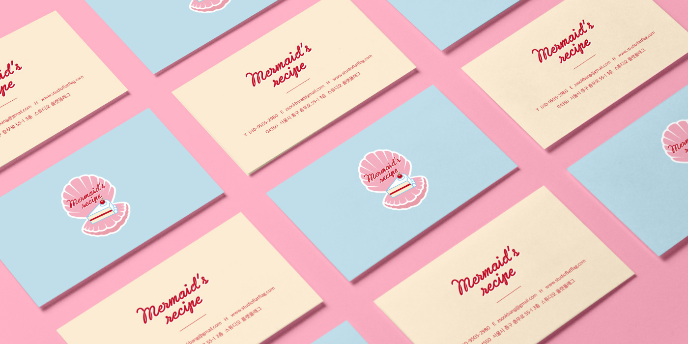 Mermaid Recipe is a dessert shop located in Seoul. We used a shell and a cake as motifs of the design for matching the cute brand name. We also focused on the fancy color of cake and macaron, so we painted the logo with the 50’s American retro colors and finally we built the romantic brand identity mood.