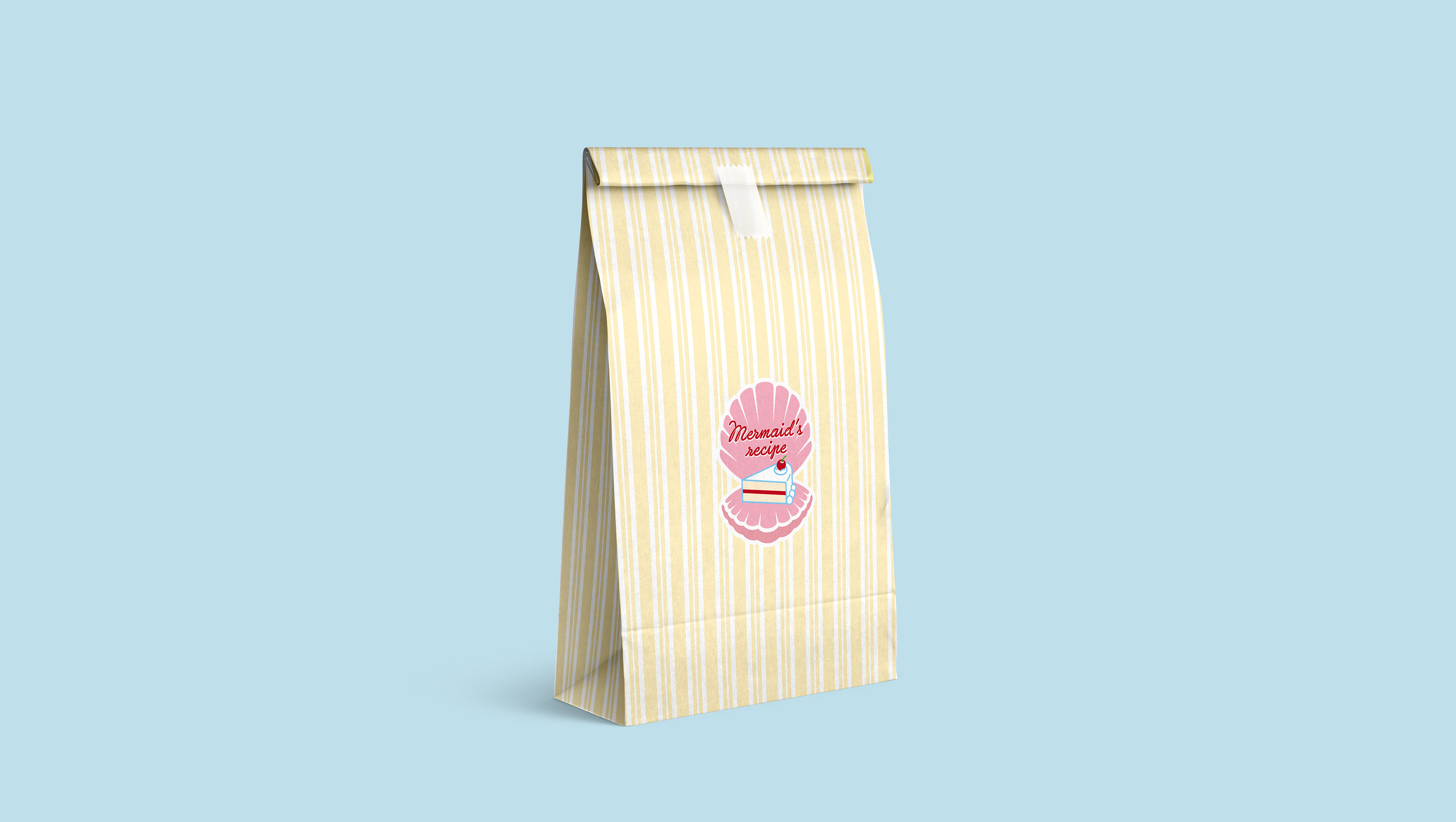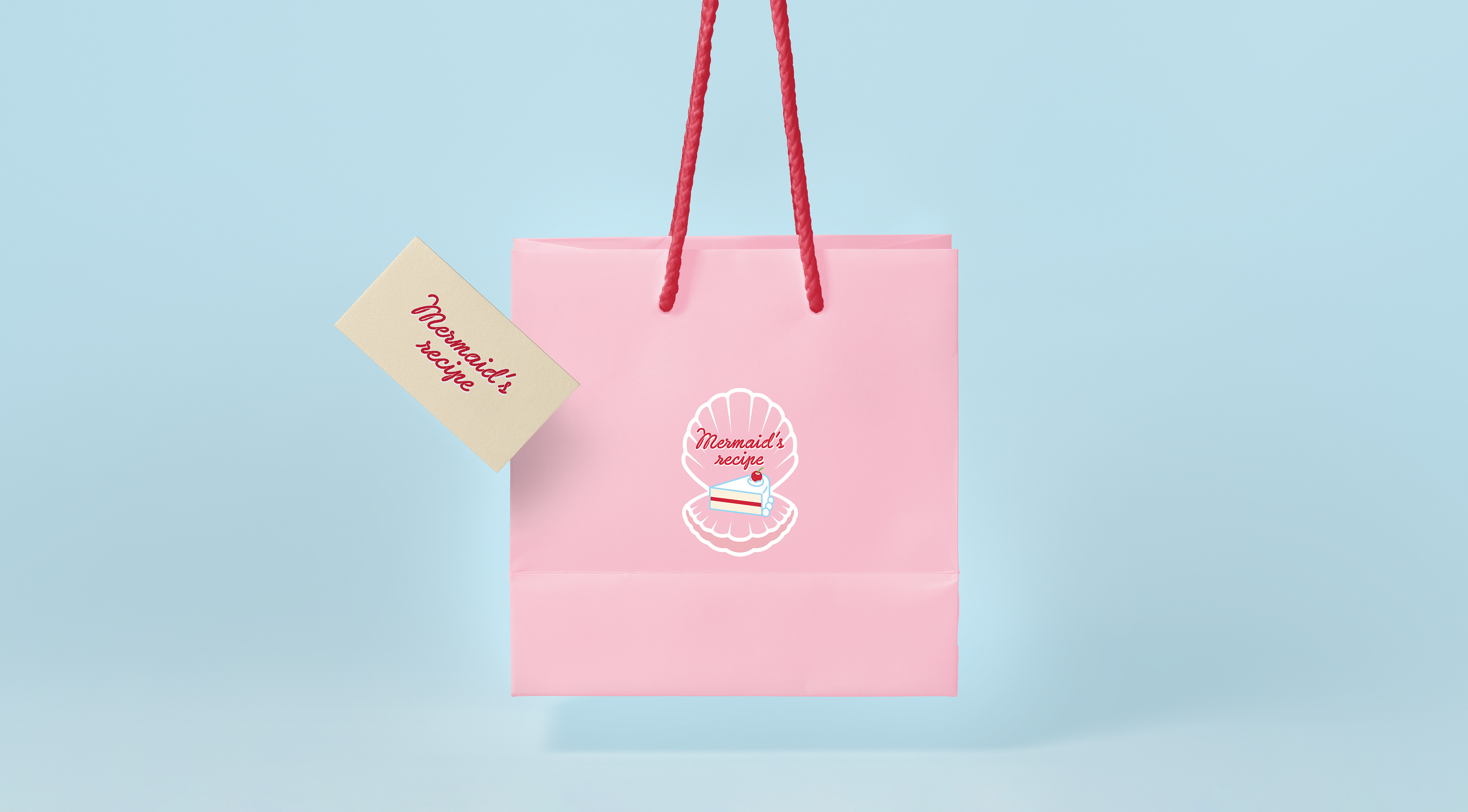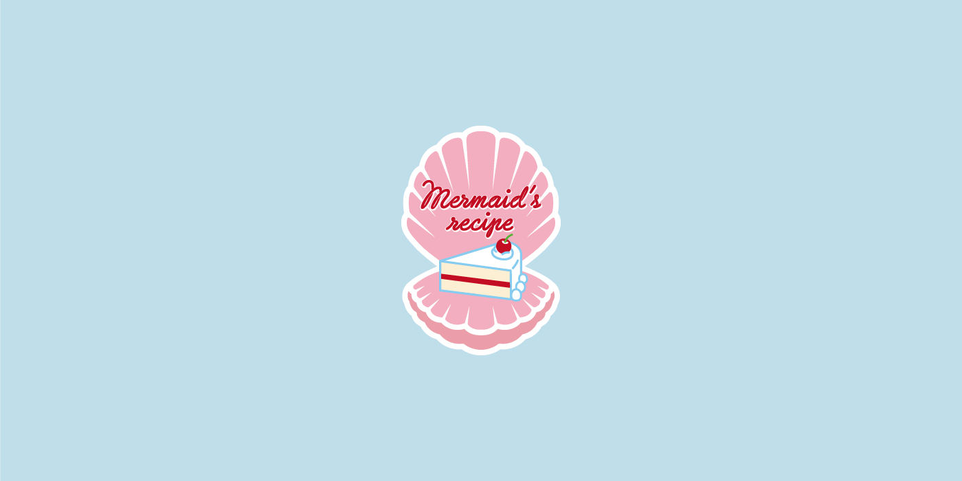 머메이드 레시피는 서울에 위치한 디저트샵입니다. 인어의 제조법이라는 귀여운 브랜드 이름에 걸맞도록 조가비와 케이크를 모티프로 작업하였습니다. 케이크와 마카롱의 화려한 디저트 색감에서 착안한 아메리칸 레트로 컬러 구성으로 낭만적인 브랜드 아이덴티티 무드를 구축하였습니다.